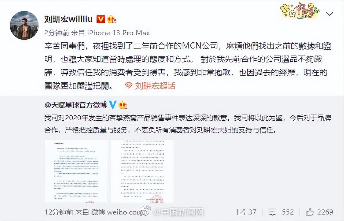 30日晚,辛巴发长文爆料刘畊宏夫妇曾卖假燕窝。对此,@刘畊宏willliu 发微博道歉,他表示昨天夜里找到了二年前合作的MCN公司要数据和证明,承认因公司选品不够严谨,导致信任自己的消费者受到损害,未来一定会督促团队更加严谨。