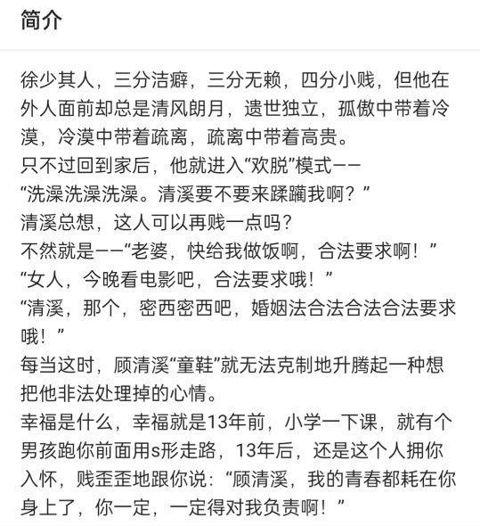 我们最后得到的往往与自己想要的事与愿违,如作者说自己本来喜欢的是成熟稳重体贴的,结果最后跟了徐微雨这个二货。徐微雨说文中的优点他现实中一个没有,其实也许就是角度问题吧。他和清溪小学初中高中时而同班,时而不同校,高中又分文理。但是他就是喜欢爱上了,别人不入他的眼。清溪算是比较慢热型的,如果徐微雨当初有一丝丝的犹豫,他们最后都不会在一起。正是因为徐微雨的坚持才最终圆满,一生一世一双人。