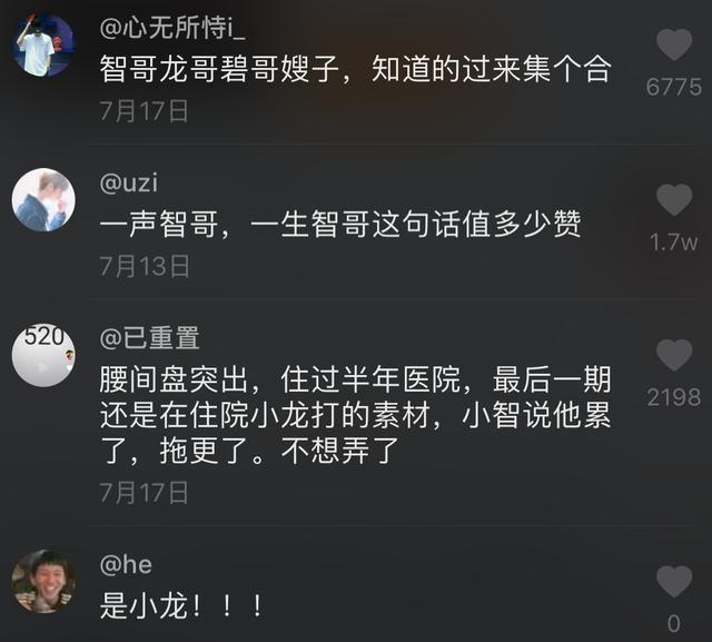 评论中大部分都感慨直言怀念当初,想念小智。说着一声智哥,一生智哥。谈论着小智经典梗里的智哥小龙碧哥嫂子表姐表妹,这是再也回不去的青春,是生命中最自在的一部分。更是希望小智能坚持走下去,依然是那个人见人爱花见花开的,带给大家第一视角的小智。