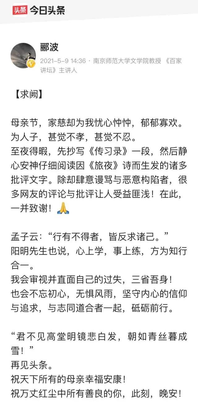 母亲节当天,当大家都在赞美母爱的博大、包容与慈爱之时,郦波老师在头条发文,文中言及因《旅夜》诗引发的种种,为减母犹,为省其身,为避责难,将“再见头条”。