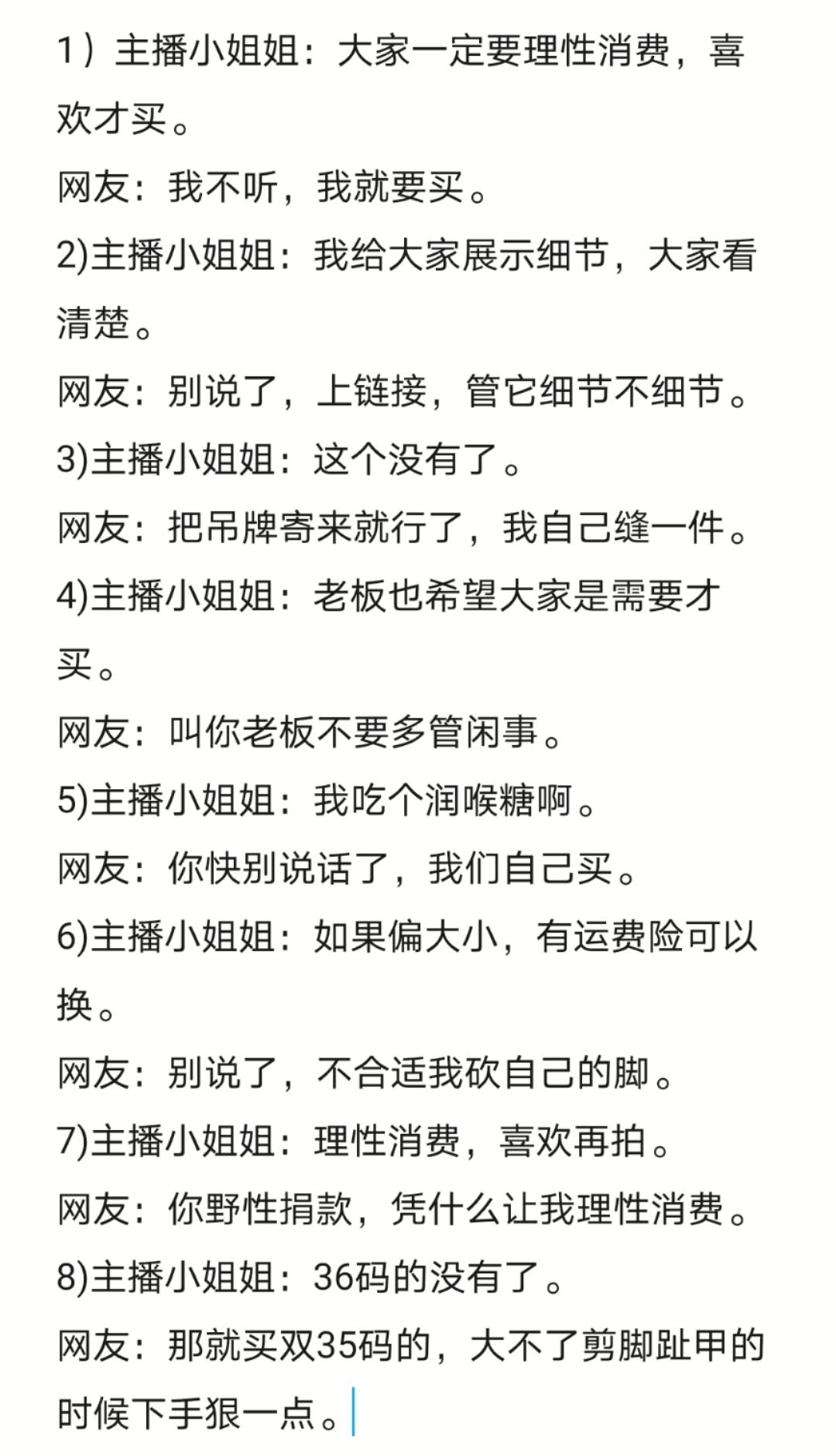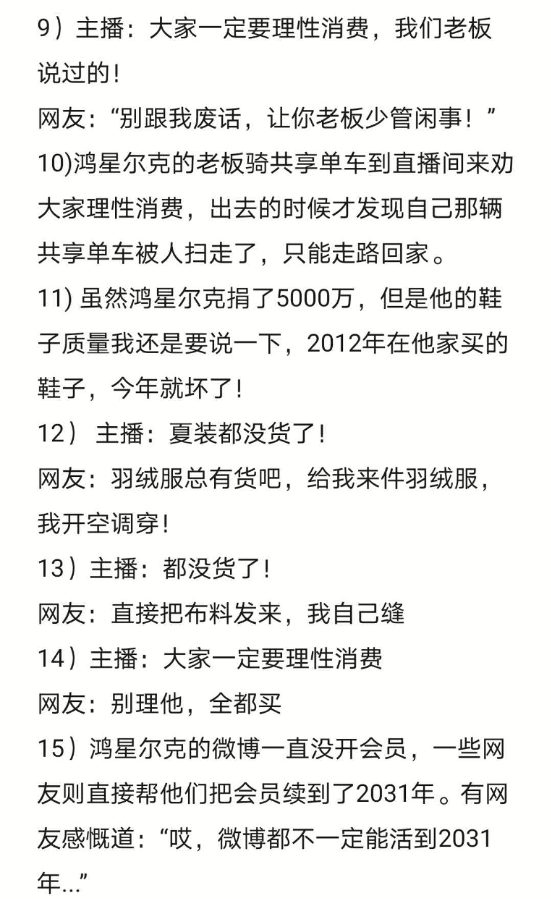 正因这样原因才有接下来我们要看到的“网友与鸿星尔克”的硬核互呛的一幕,一些关于鸿星尔克的“笑话”,也被无数网友发了出来,真真是能把人笑死: