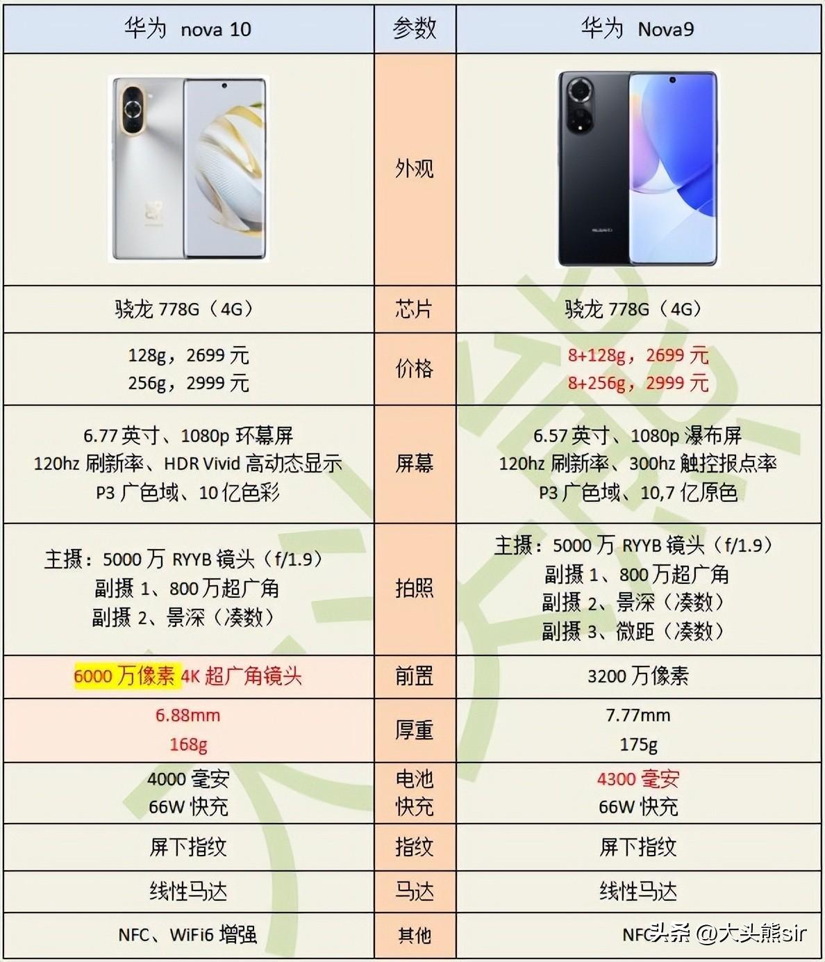 而nova10相比nova0仅仅升级:1、前置镜头从3200万升级6400万像素。2、手机变得更轻更薄。