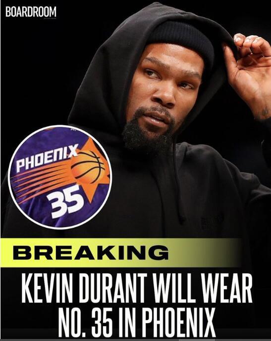凯文-杜兰特投资的体育媒体Boardroom宣布,杜兰特将在太阳穿35号球衣。