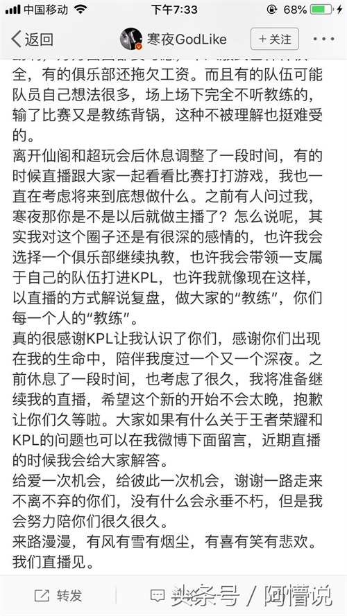 5月4日下午,寒夜发了一条长微博,讲述自己做KPL教练以来的心路历程。直言做教练真的很累,但是不会放弃。