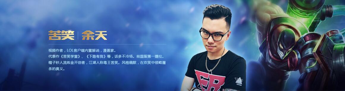 苦笑是一名客户端内置解说,苦笑学堂就是他制作的,前国服第一婕拉,帽子秒人炼金就是他创作的.是许多LOL玩家喜欢的主播之一.