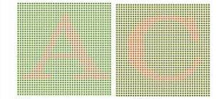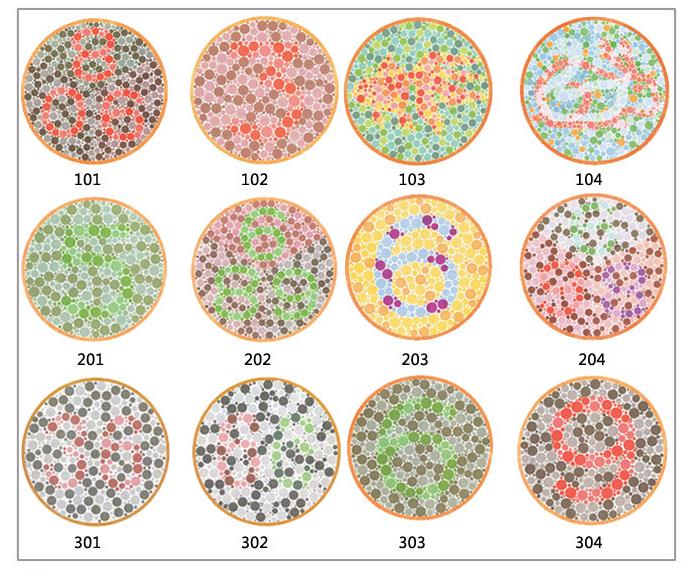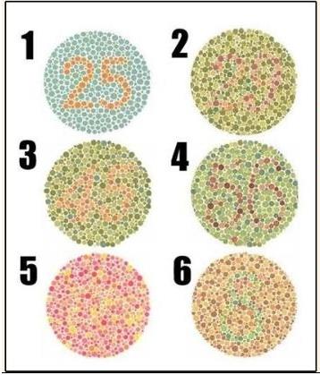 下图通常称为色盲本,它是利用色调深浅程度相同而颜色不同的点组成数字或图形,在自然光线下距离0.5m处识读。检查时色盲本应放正,每一图不得超过5秒。色觉障碍者辨认困难,读错或不能读出,可按照色盲表规定确认属于何种色觉异常。这也是驾考体检采用的方法。