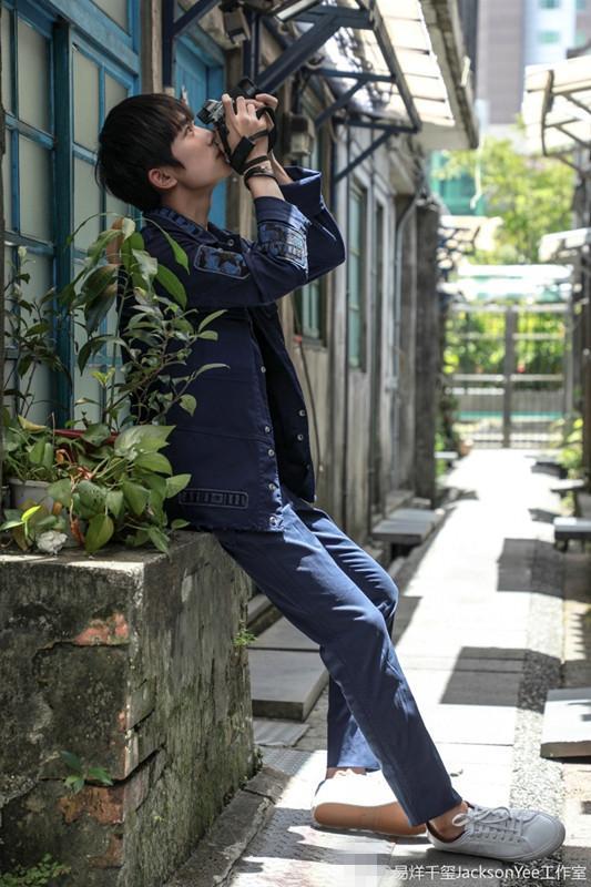 换上牛仔套装的易烊千玺变身摄影师,拍照的姿势也很专业哦。