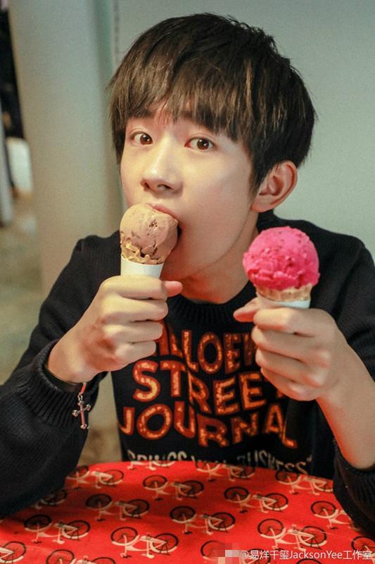 易烊千玺双手各拿一个冰淇淋,这吃冰淇淋的模样也是超萌的有木有。