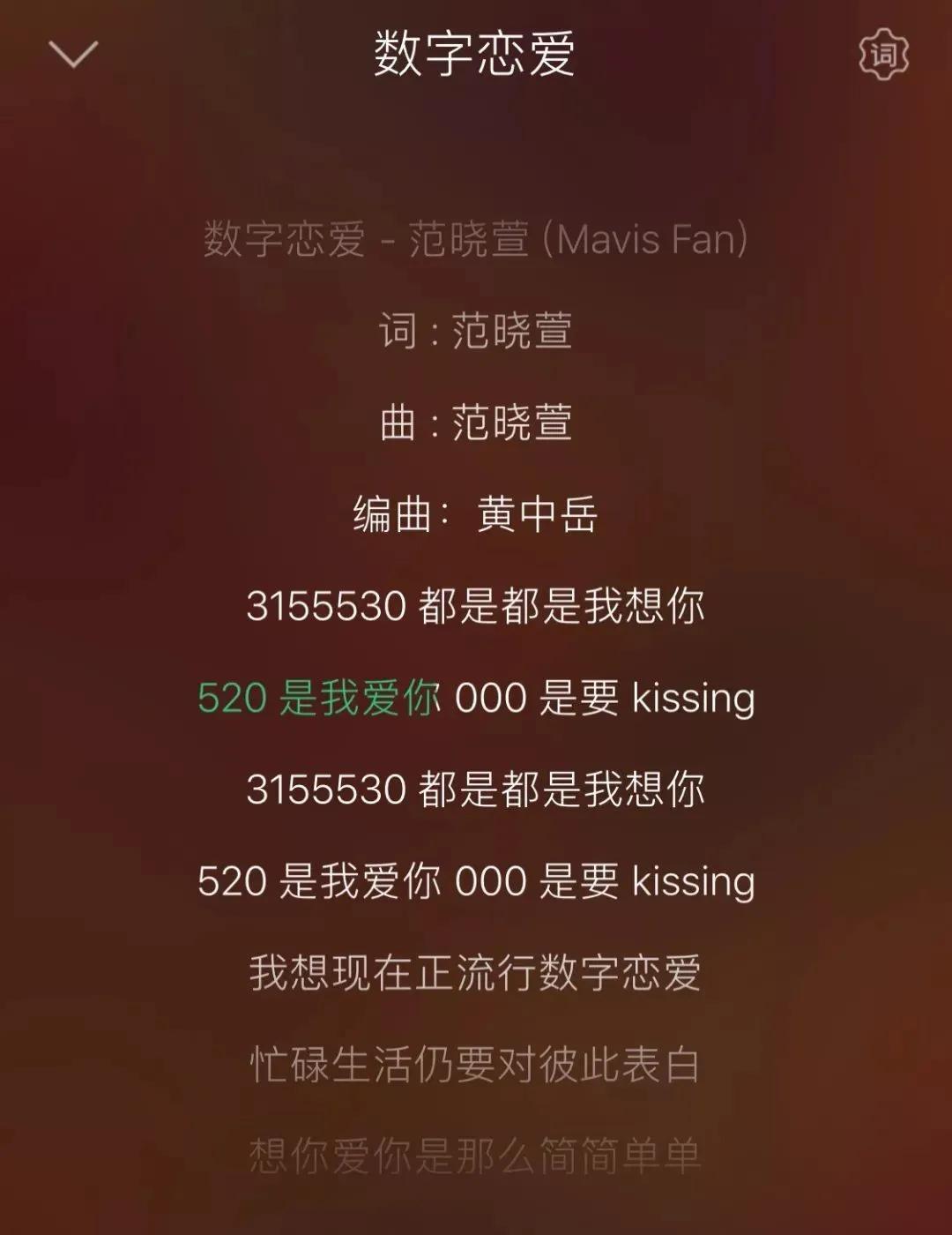 “520”网络情人节的由来,其实有好几种说法。其中一种说法就是:1998年台湾歌手范晓萱发行了一首名为《数字恋爱》的歌曲,歌词中,将“520”阐释为“我爱你”。