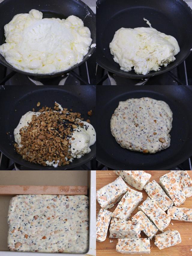4️⃣放入花生碎、黑芝麻搅拌均匀,关火,戴手套整理成型。冰箱冷藏定型后切小块即可。