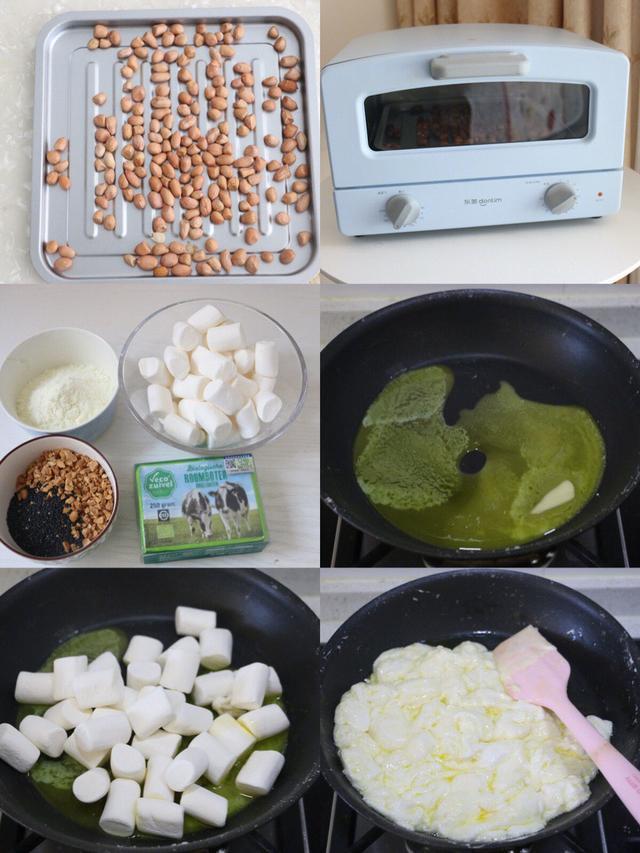 棉花糖180g、黄油60g、奶粉120g、花生80g、黑芝麻10g