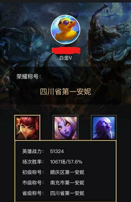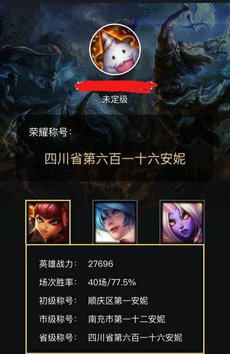 我们再来膜拜一下这位大神,四川省第一安妮。而同样是这位玩家,他表示自己的小号在另外一个大区,只是玩的少了,战斗力不够,按道理说,自己的大号小号都是同一个人,大号四川省第一,小号不该是四川省第二吗?结果却显示是四川省第六百一十六安妮,可能这个只跟战斗力有关吧!