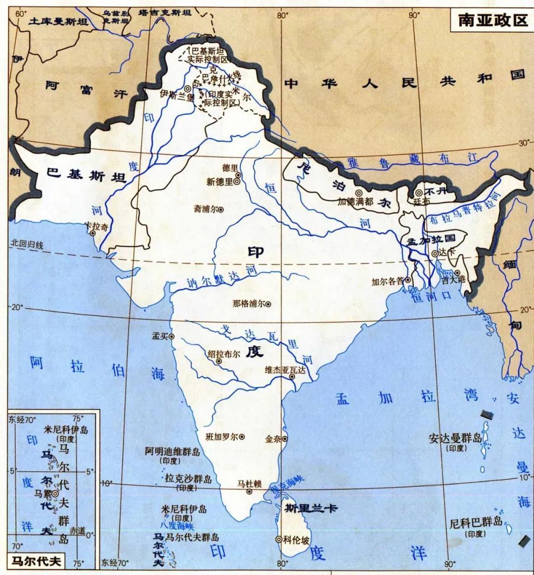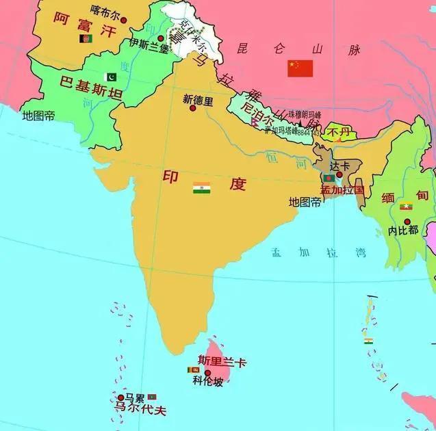 ③南亚有七个国家,其中印度、巴基斯坦和孟加拉国为临海国家,尼泊尔和不丹位于喜马拉雅山的南坡,为内陆国,斯里兰卡和马尔代夫为岛国。