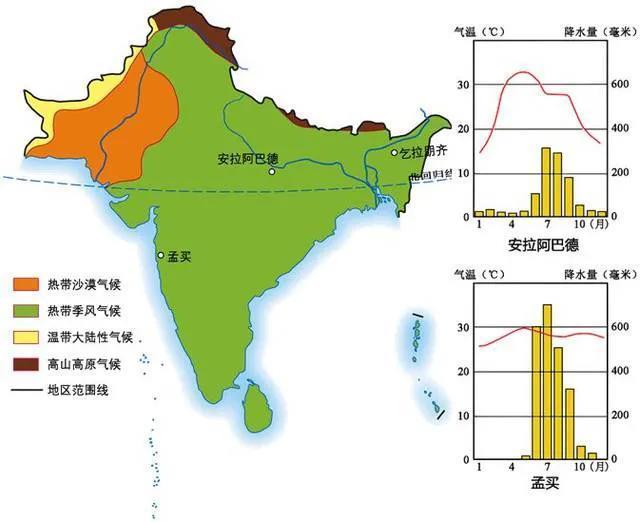 3.①南业广大的地区为旱雨两季的热带季风气候,雨季(6~9月)降水量大,早季(10月~次年5月)炎热少雨,多旱灾。旱季后期(3~5月), 随着太阳直射点北移,气温迅速升高,印度半岛北部的气温在45C以上,出现一个“热季”