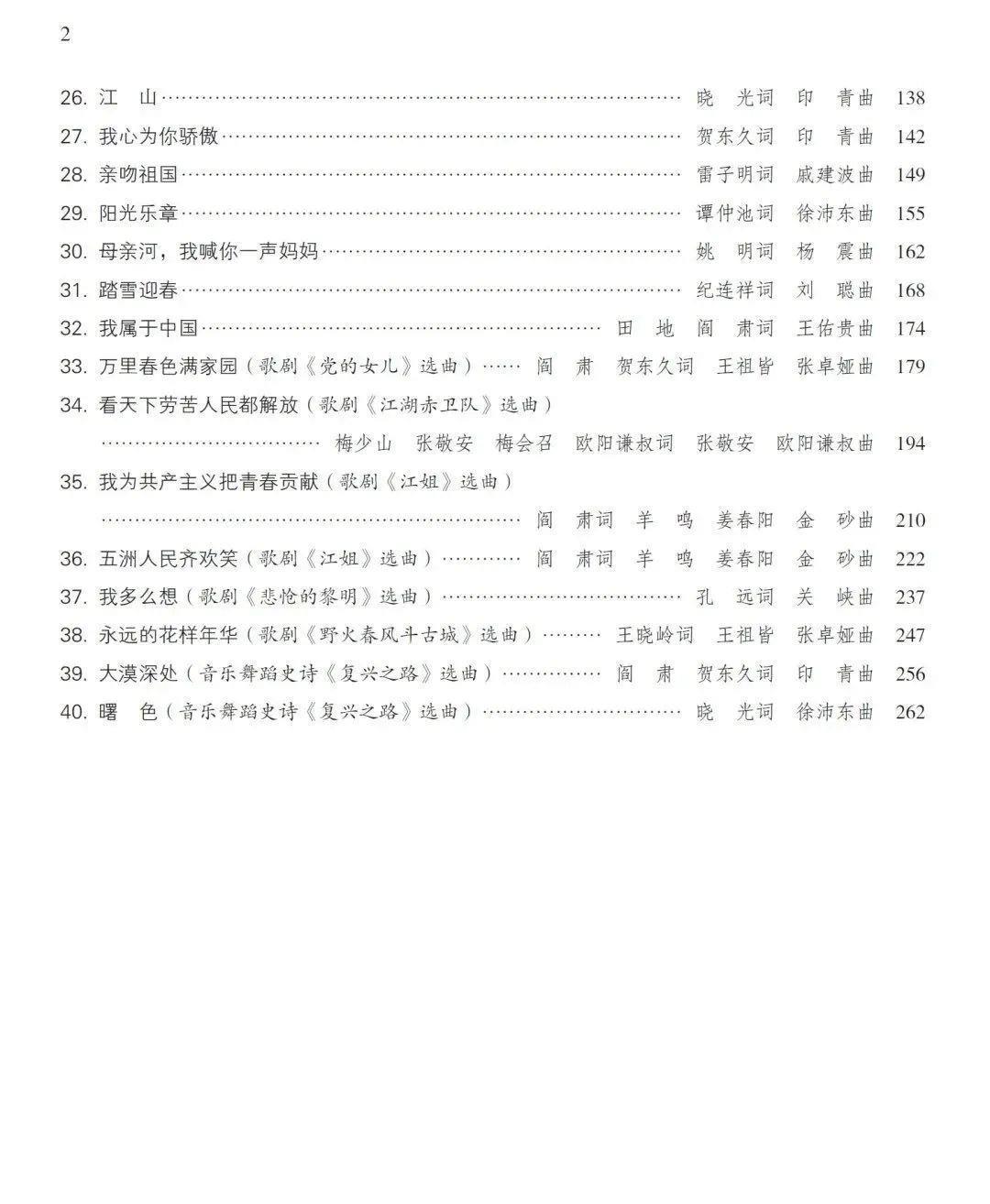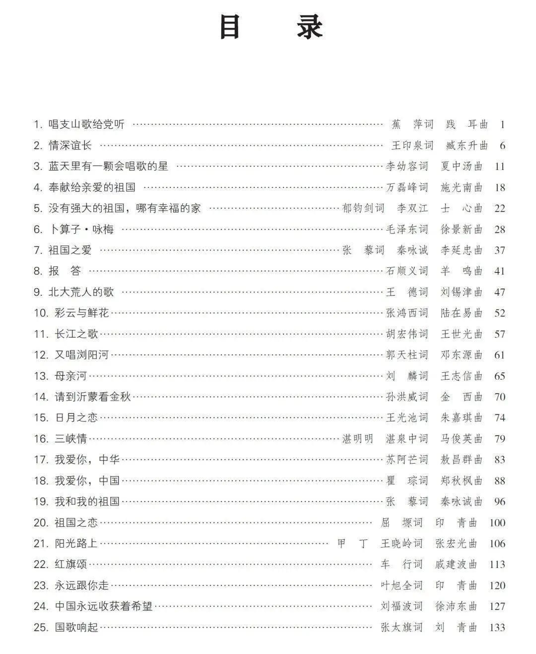 《游击队歌》《保卫黄河》《松花江上》《再见了,大别山》《唱支山歌给党听》《歌唱祖国》《我为共产主义把青春贡献》《长江之歌》《我爱你,中国》《西部放歌》《在希望的田野上》《我和我的祖国》…………