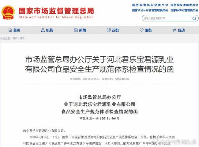 国家市场监管局对河北君乐宝君源乳业、石家庄君乐宝太行乳业连续发函通报质量检查缺陷情况