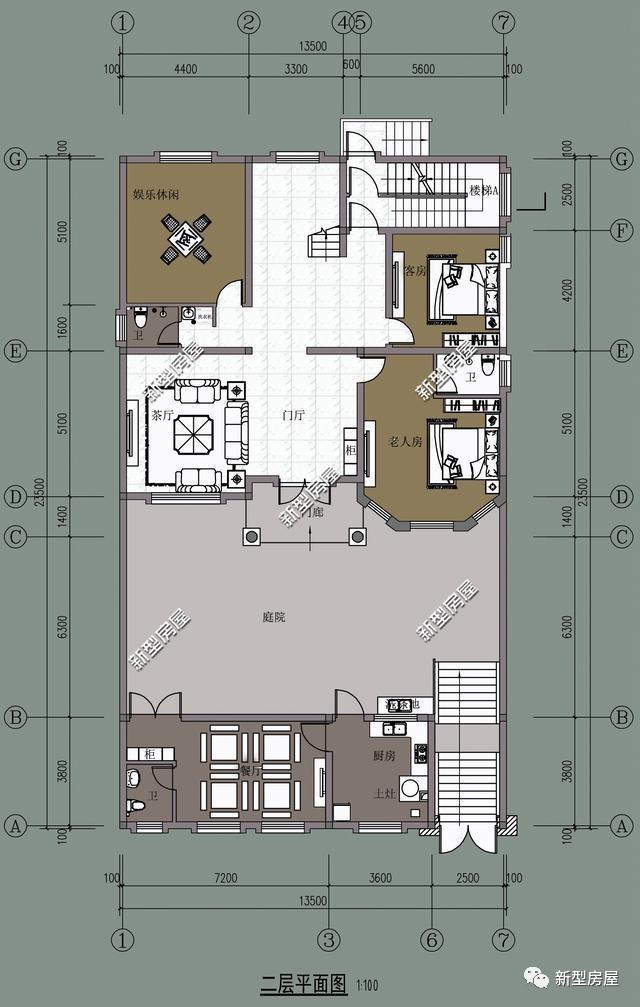 二层基本建筑情况:1厨房、1餐厅、1茶厅、1门厅、2卧室、1娱乐室。
