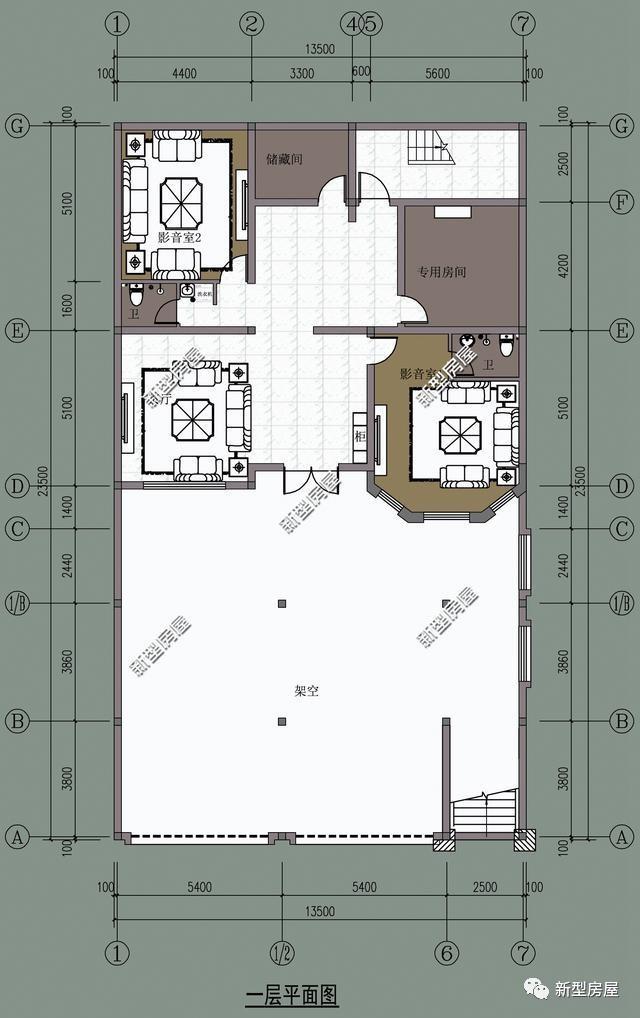 一层基本建筑情况:2影音室、1储藏间、1客厅、1专用房间、2卫生间。