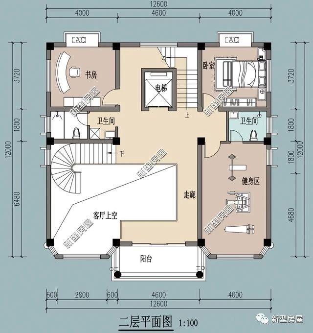 二层基本建筑情况:1健身区、1书房、1卧室、2卫生间。