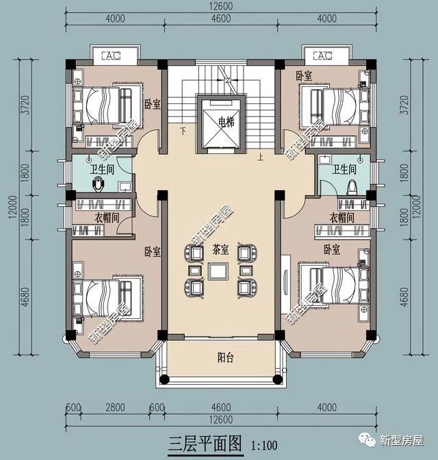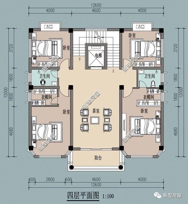 四层基本建筑情况:1茶室、4卧室、2衣帽间、2卫生间。