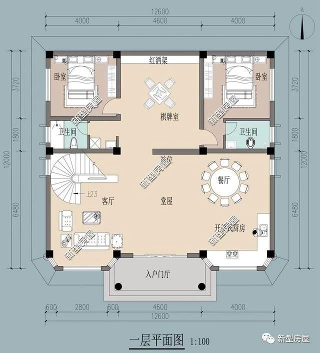 一层基本建筑情况:1堂屋、1客厅、1餐厅、1厨房、1棋牌室、2卧室、2卫生间。