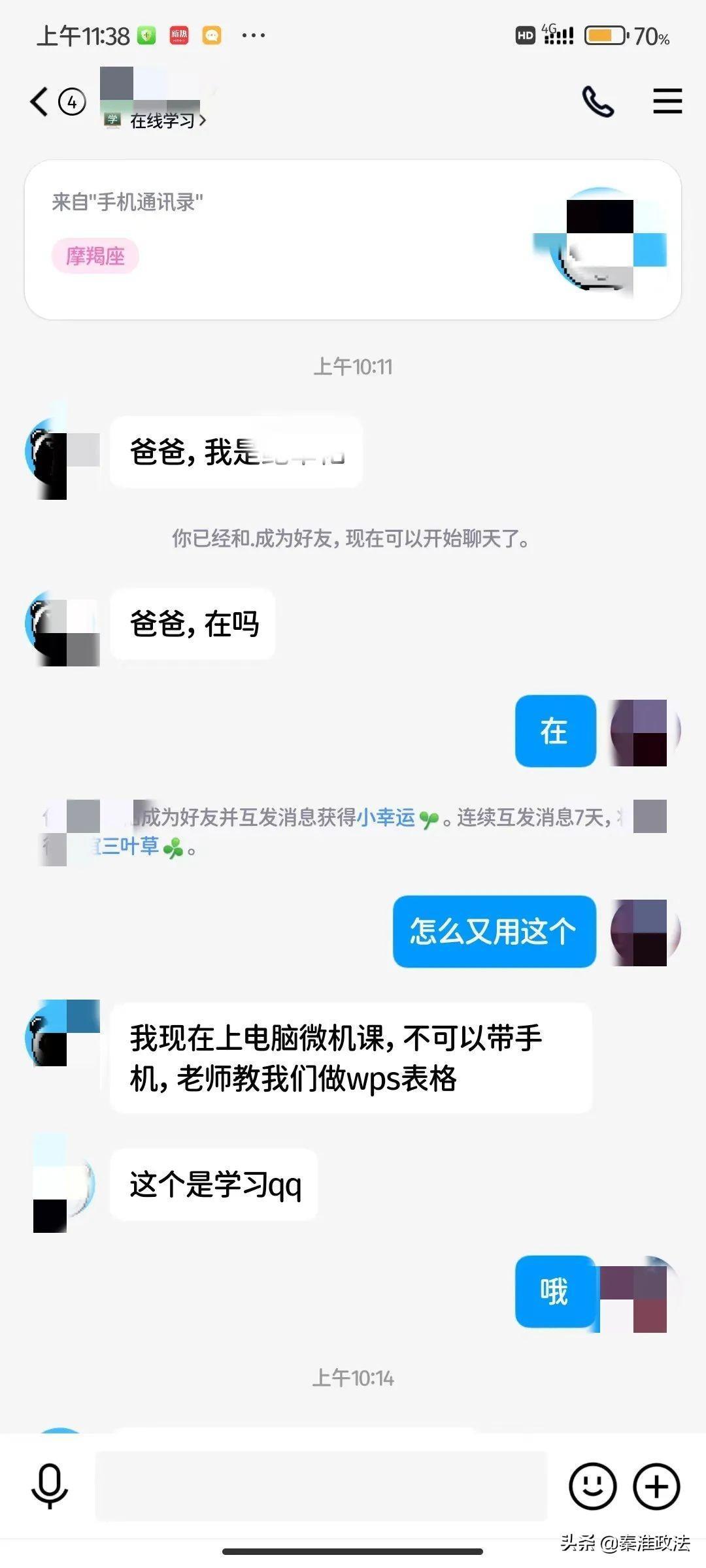 2、用陌生号码添加家长QQ、微信,并称原账号被盗、手机不在身边的,很可能是骗子。