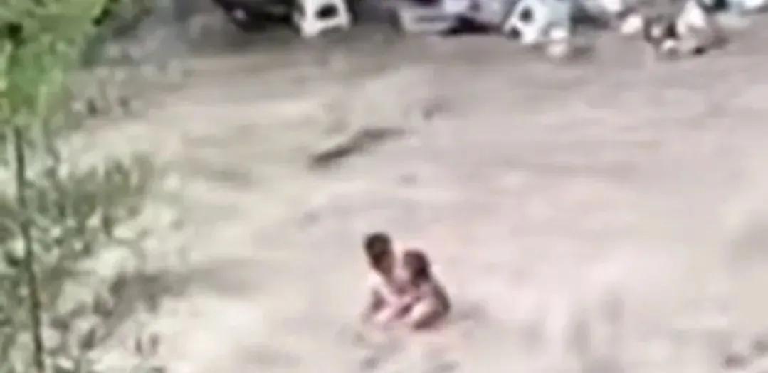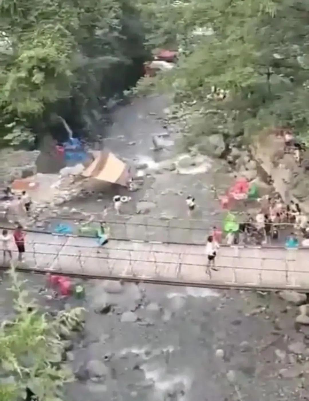 后来,突而其来的山洪倾泻而下,很多游客躲避不及被冲走,其中有一位父亲抱着儿子绝望无助地坐在石墩上被凶猛、湍急的洪水围困刷屏,令人揪心,后来看到视频,他俩也被洪水冲走了,生死未卜。