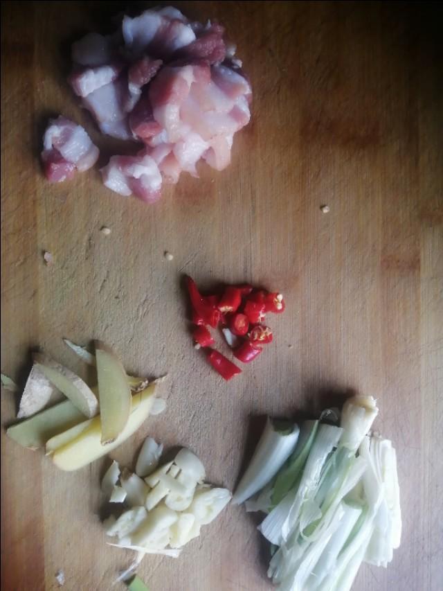 3.把葱切段,姜切片,蒜切片,五花肉切片,小辣椒小段备用。