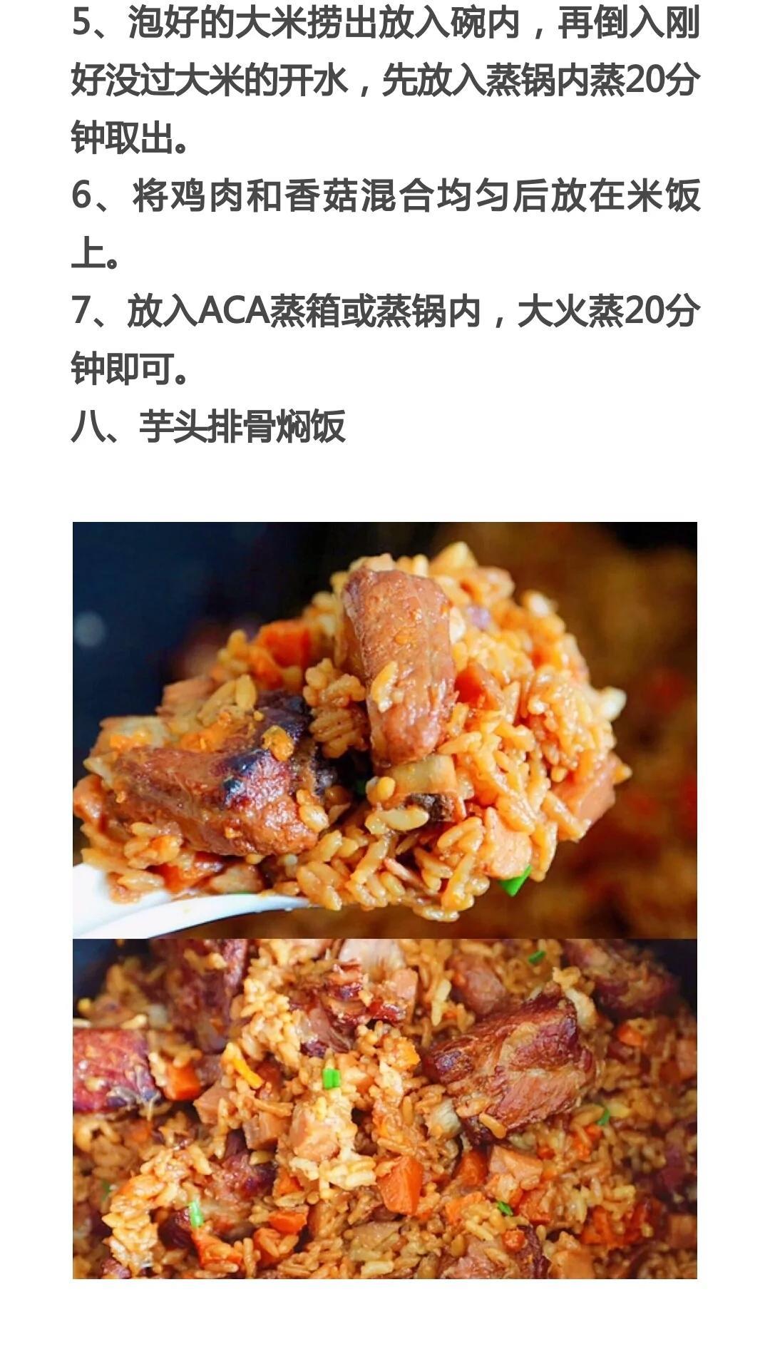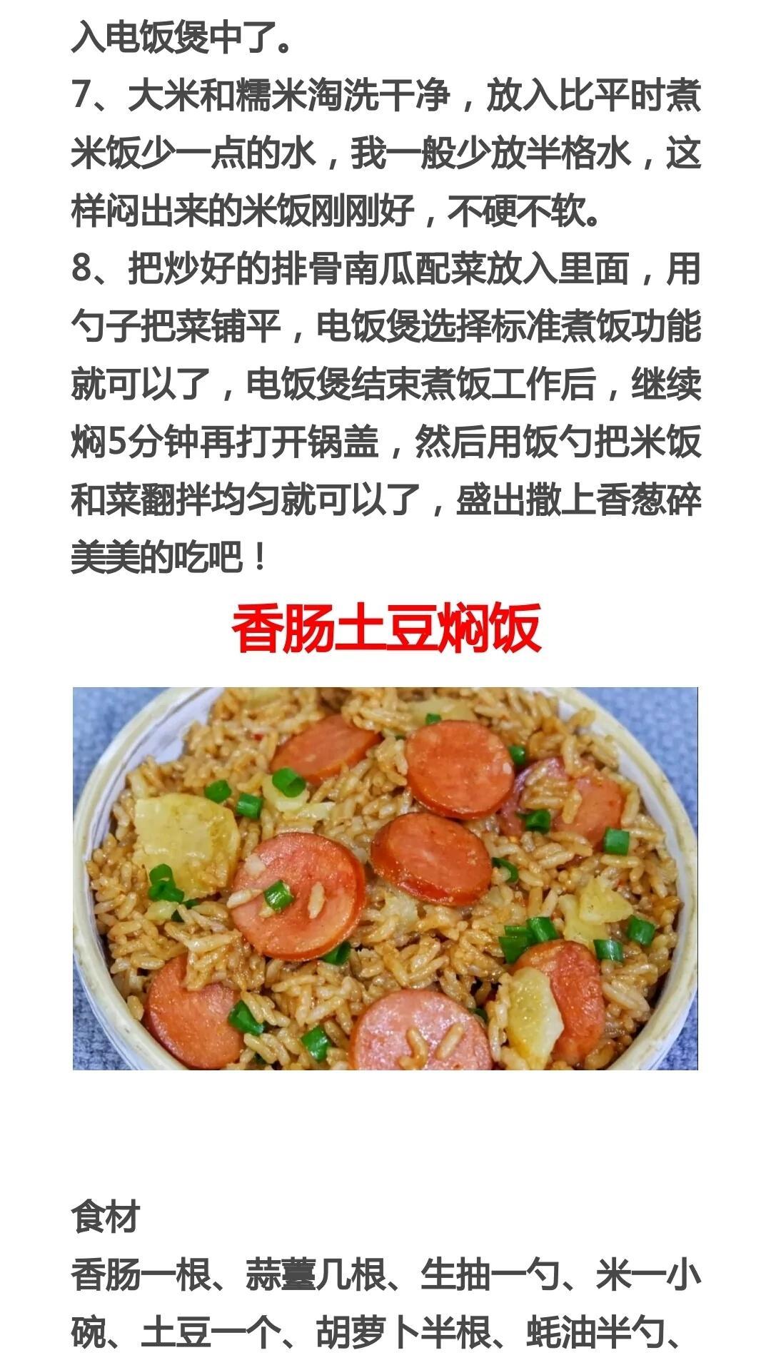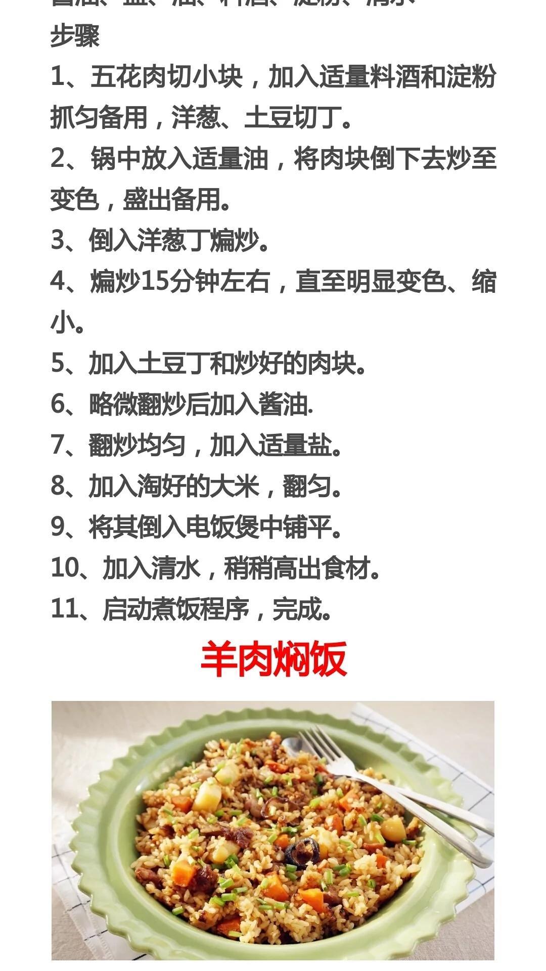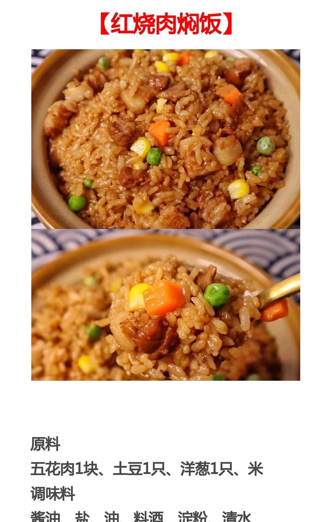 下面是红烧肉焖饭、羊肉焖饭、南瓜排骨焖饭、香肠土豆焖饭、鸡腿菜蔬焖饭、腊肉焖饭、五花肉芋头焖饭、香菇鸡肉焖饭、芋头排骨焖饭、腊肠时蔬焖饭