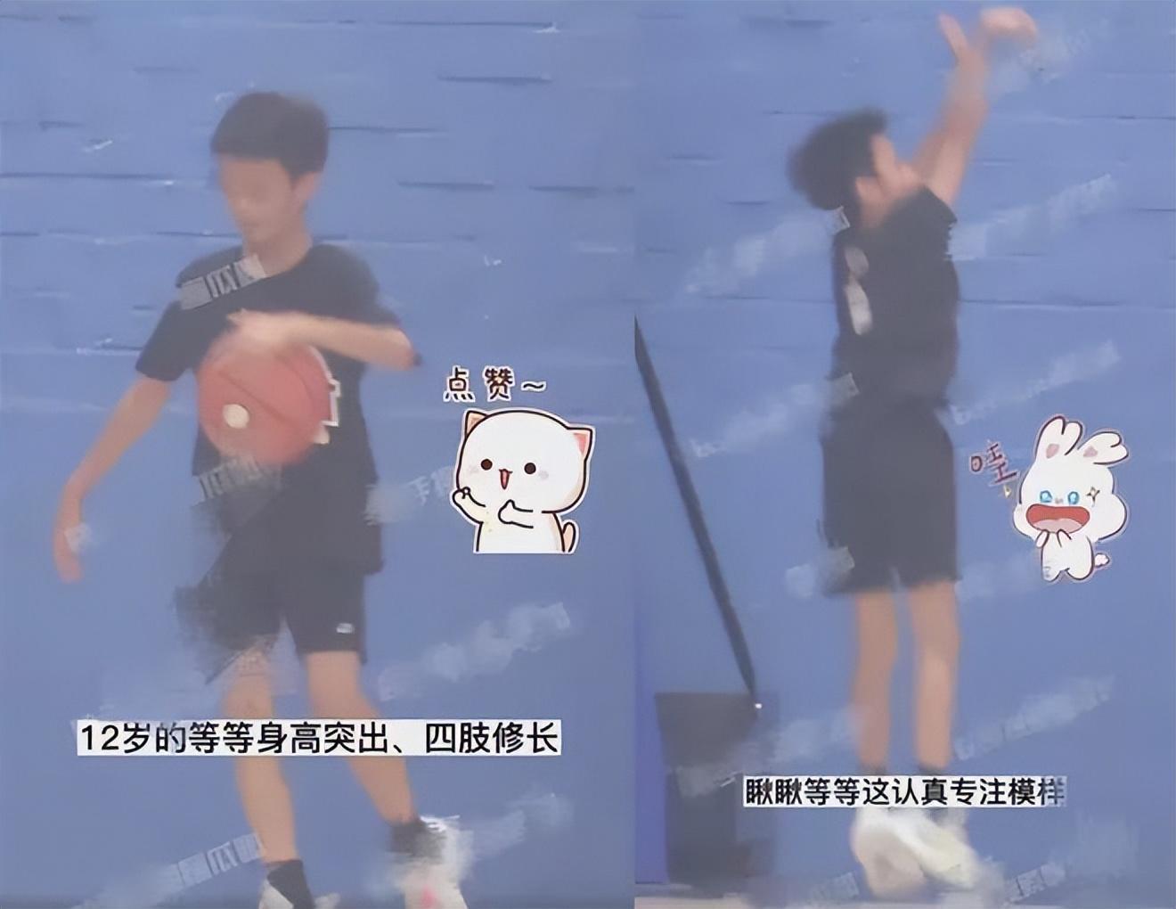 即将12岁的等等在篮球场上自信洒脱,他顶着利落短发,穿着黑色运动装束,四肢修长,展现出十足的大高个帅哥风范。