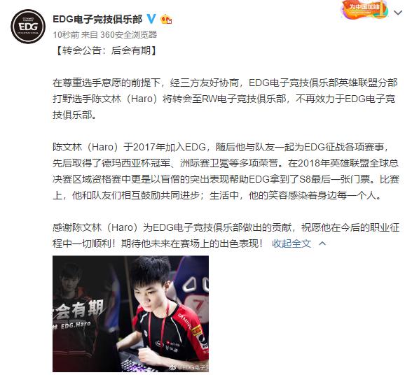 北京时间5月22日,英雄联盟LPL俱乐部EDG发布一则转会期人员变更,打野选手Haro转会RW战队: