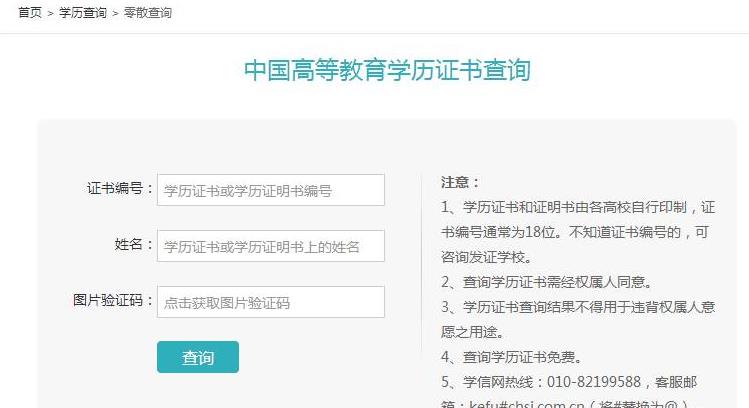 第五步:若非本人查询,可以在学历查询的页面点击“零散查询”,输入证书编号、姓名、和验证码即可查询。