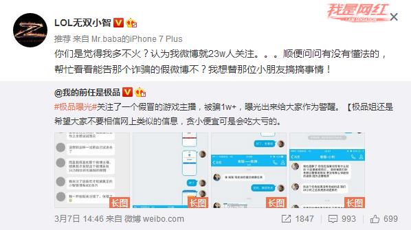近日,LOL主播无双小智遇到了一件烦恼的事情,发现有人冒用他的名头在微博上发布虚假信息并且行骗,并且不是一般的骗子号,这个微博帐号也是处心积虑,至今积累了25W粉丝的高仿号!