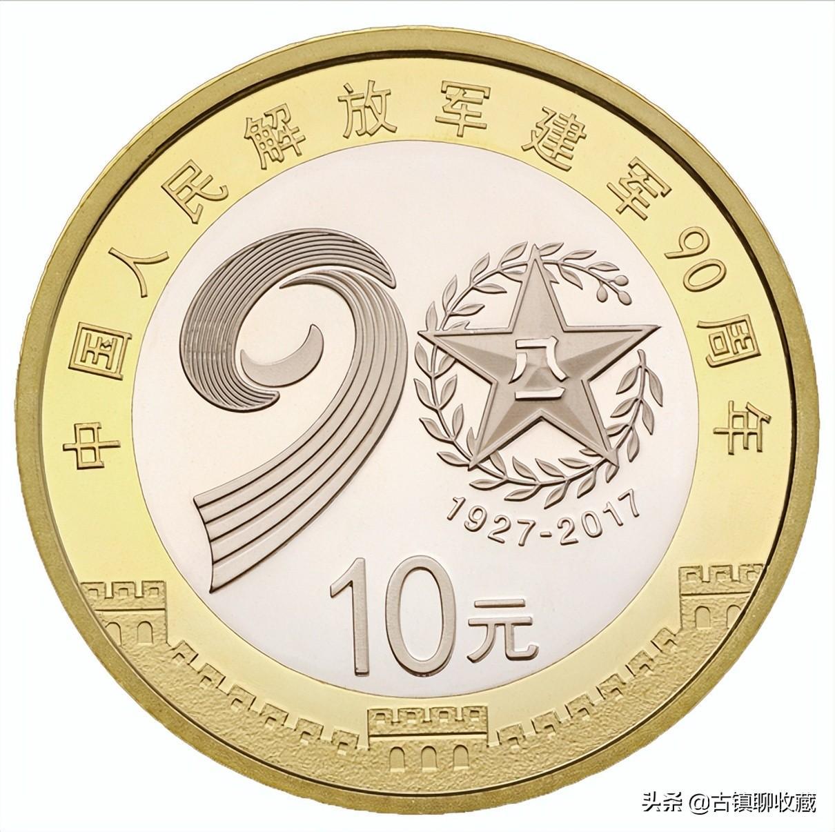建军90周年币发行于2017年7月31日,在,面值10元,直径27毫米,材质双色铜合金,发行量2.5亿枚。