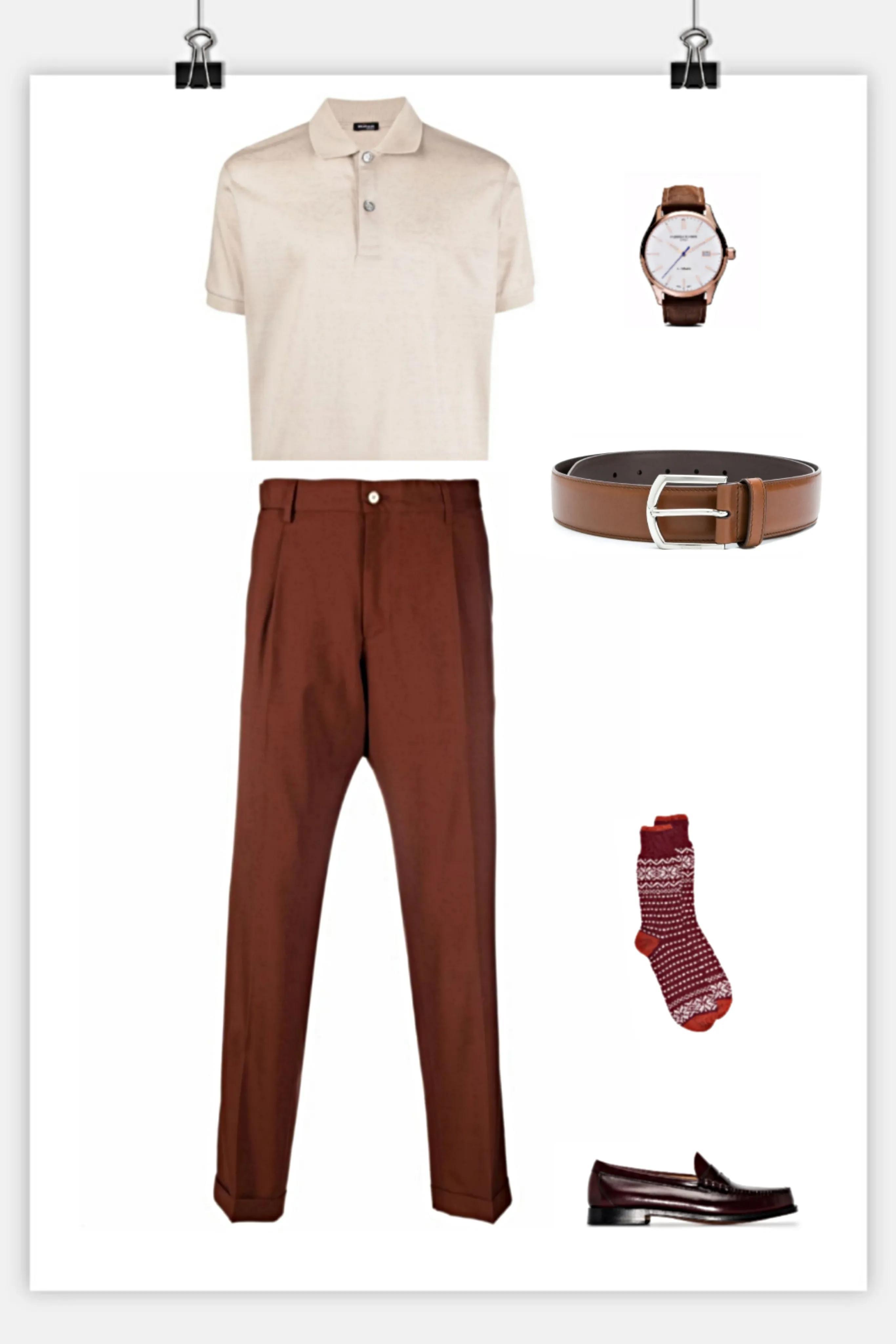 搭配红棕色的裤子、深棕色的皮鞋,皮带的亮度介于上衣跟裤子之间,让整体从上到下由浅入深,慢慢渐进,层次细腻,符合米灰色的柔和精神内涵。