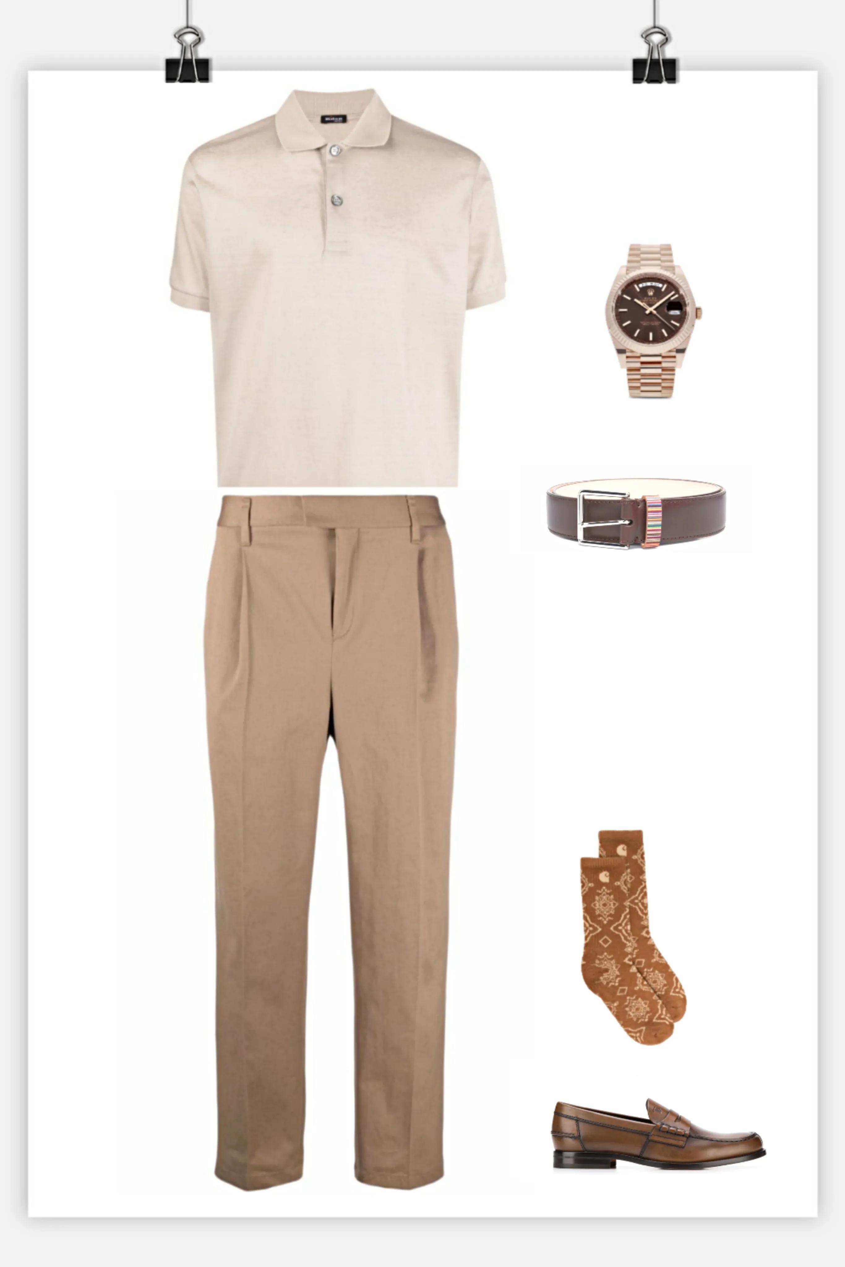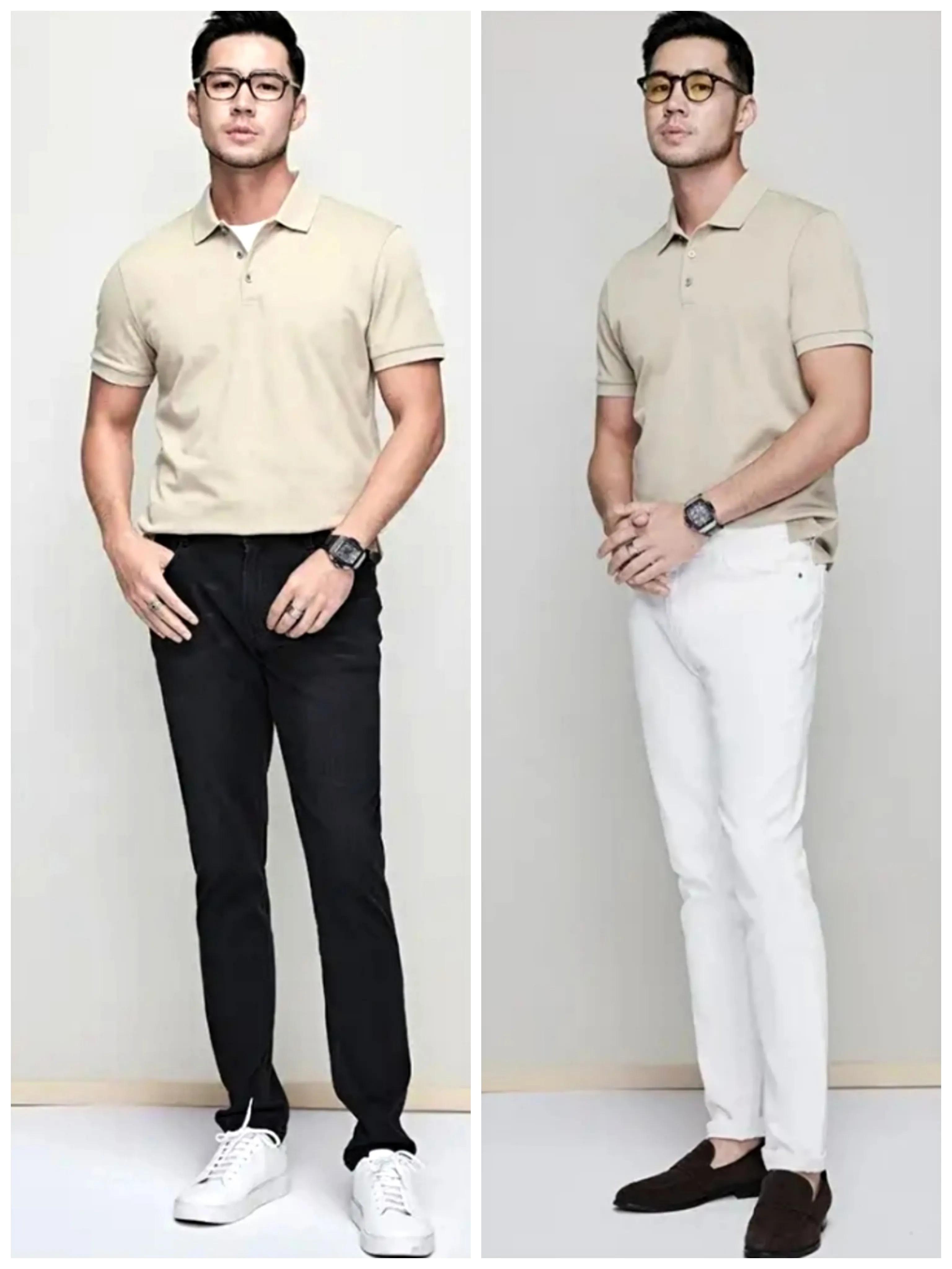 我就以这件米灰色POLO衫为例,运用色调统一原理搭配几套给大家参考。