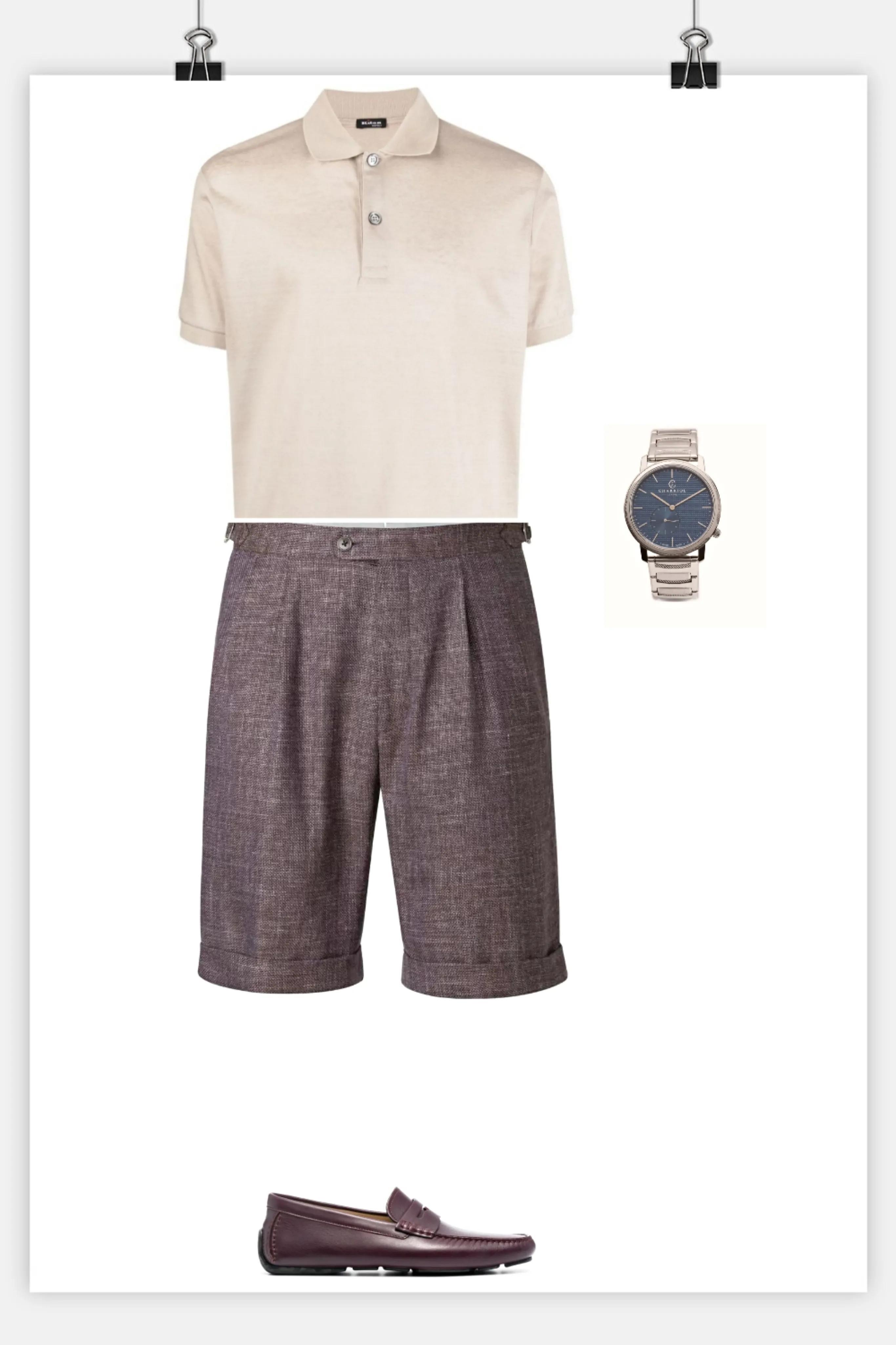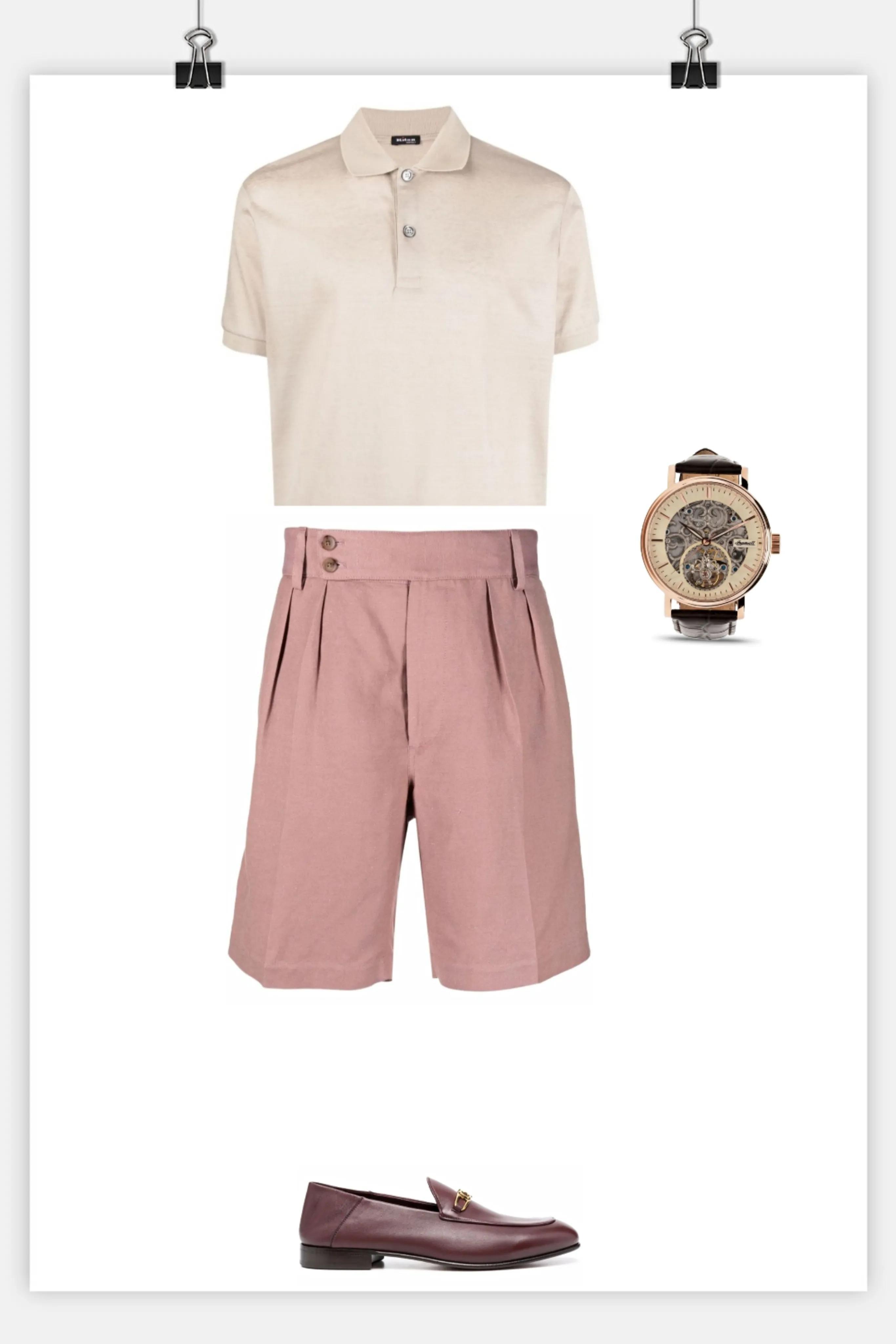 搭配鲜亮的粉色短裤和亮棕色乐福鞋给净色调穿既精神又雅致,其他色调的人穿着会过分艳丽显得俗气。