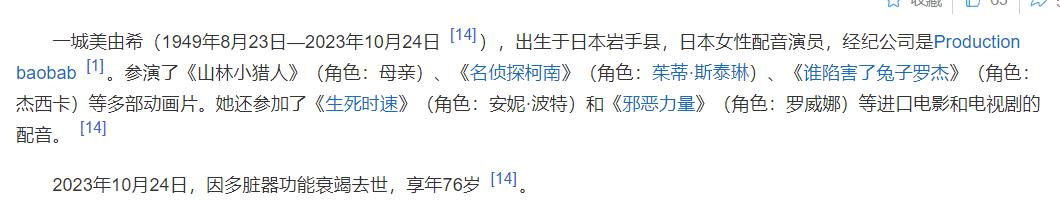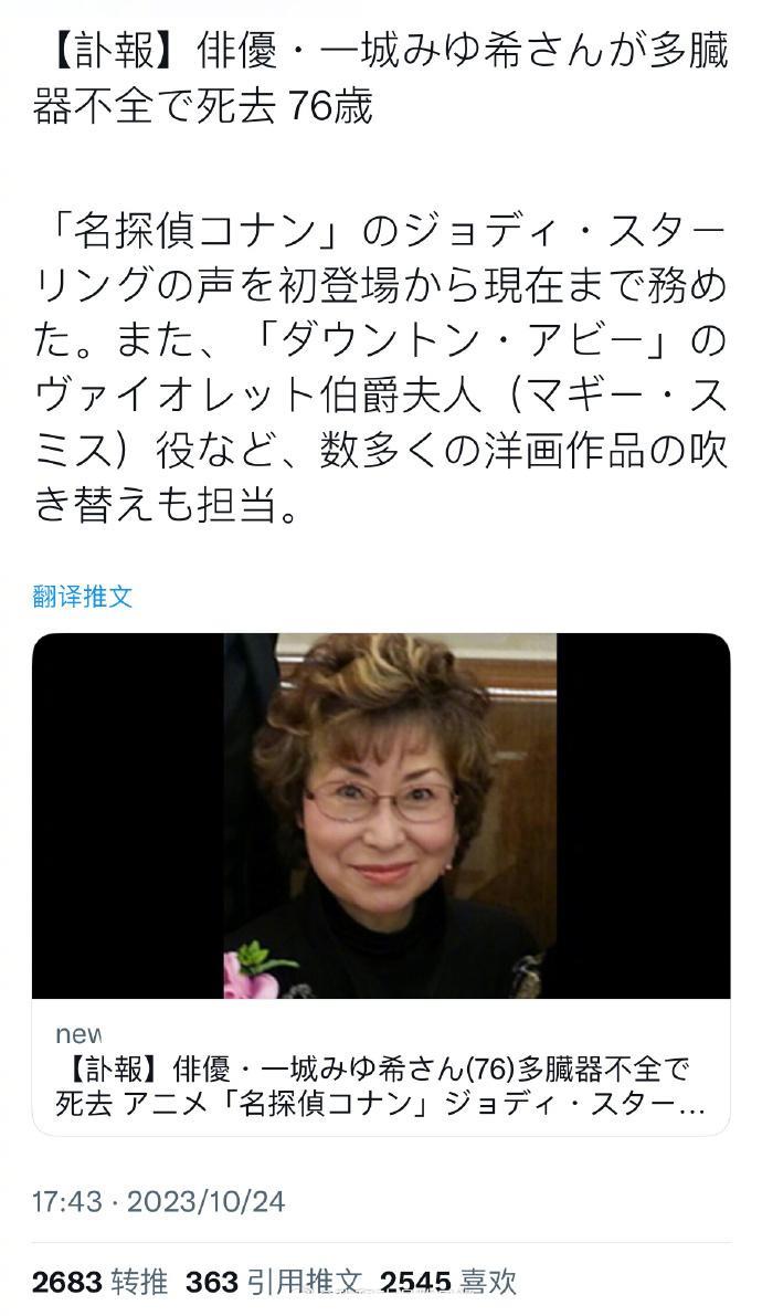 据日媒报道,知名声优(配音演员)一城美由希在10月24日病逝,享年76岁。