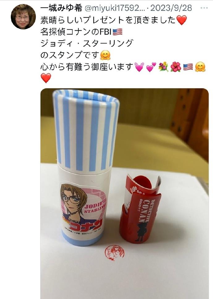 而就在9月底,她的社交平台上还晒出了《柯南》周边产品——朱蒂老师的卡通印章。