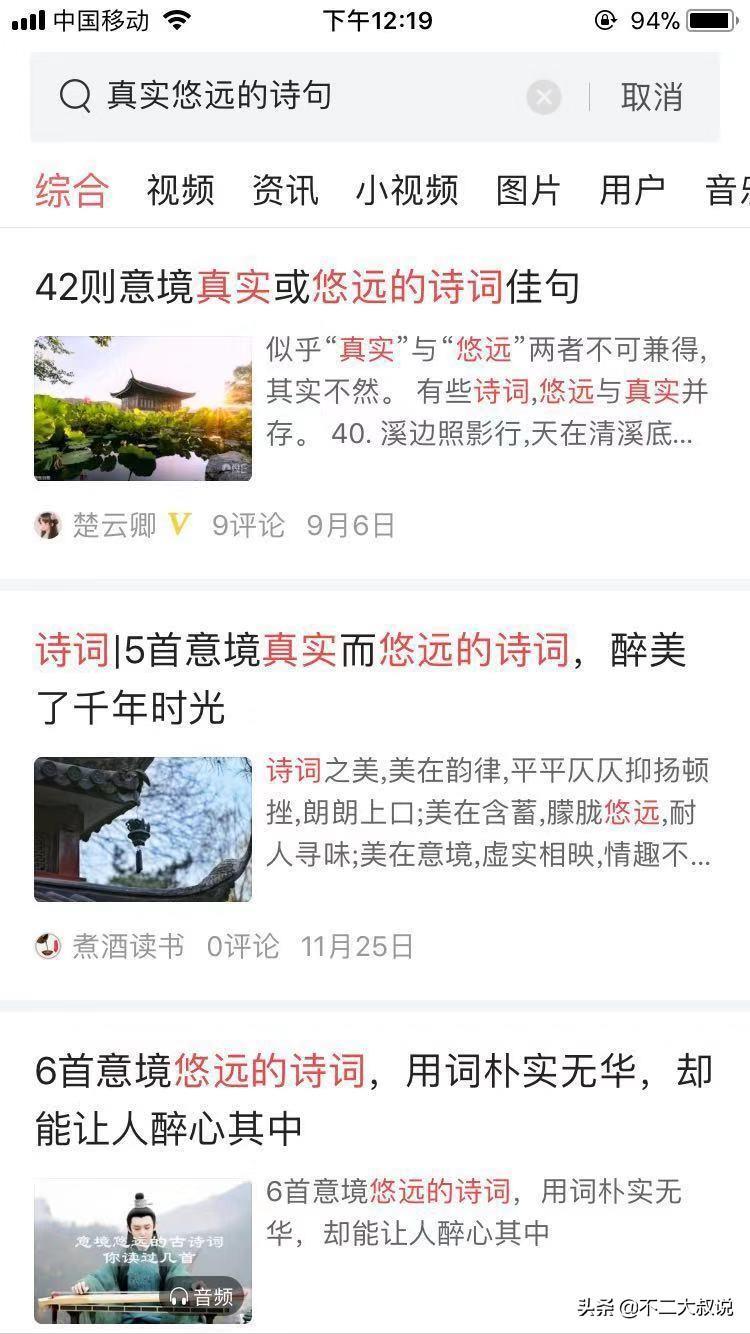 用今日头条app上方的搜索框输入:真实悠远的诗句,享受那美好的时光