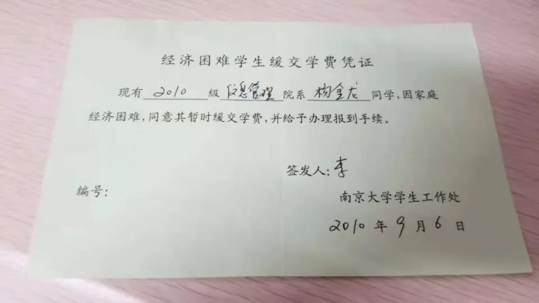 杨金龙出生于甘肃会宁一个贫穷的山村,父母是农民,庄稼十年九旱无收,上大学时,家里贫困。“刚到南大没钱吃饭,一顿饭往往是1块钱的米饭加4毛钱的包菜解决。上南大第一学期我就还清了家里的8000元贷款,第二学期就自己花钱买了电脑。一方面因为我家里贫困,可以得到一些助学金或学费减免;一方面我也比较努力,获得不少奖学金,其中2万块钱的大额奖学金就获得过好几次。”