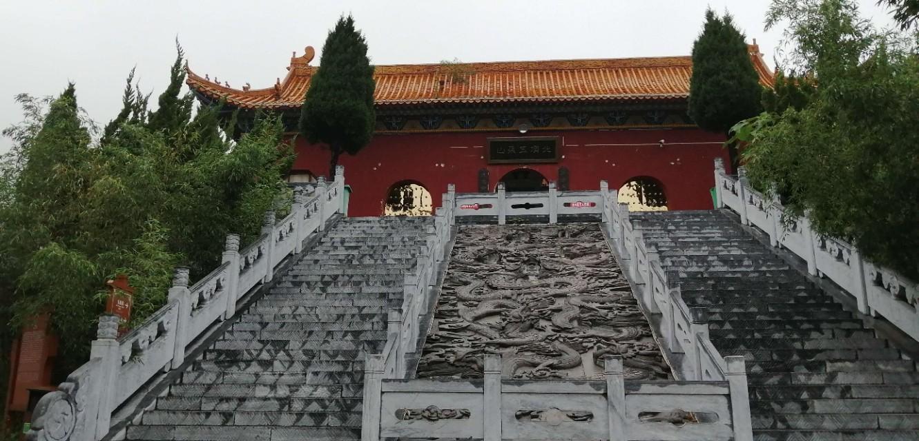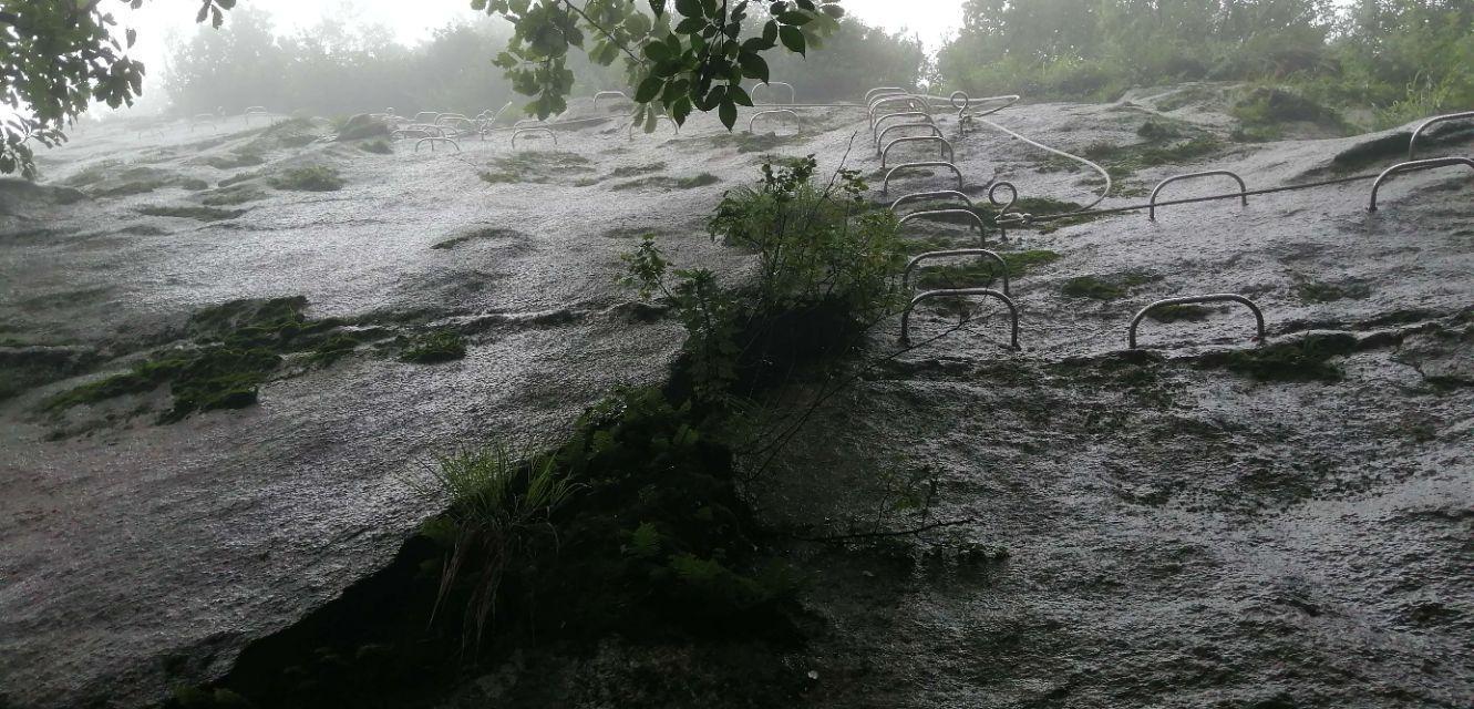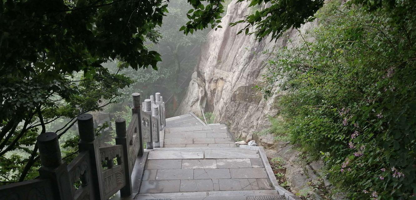 五朵峰奇峰相峙,“奇立孤峰”之圣顶海拔1639米,距离金顶南天门3.6公里,游客可以选择乘坐索道登顶。以前在其他景区也有坐过缆车,相比这里的缆车虽不是最长的也不是最险的,但却是坡度最陡,落差最大的,“五朵”山上的索道被誉为“中原第一索”。是日,选择登山步道前行,沿途4000多级石阶,台阶最陡处达70度左右,徒步攀登五朵山是对体力和耐力的一次挑战。