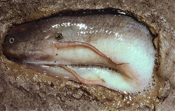 为了应付旱季的恶劣环境,非洲肺鱼演化出了一种特殊的生存方式,每当旱季来临之时,它们就会钻进水底的淤泥之中,当达到一定深度的时候,它们的皮肤就会大量地分泌出一种特殊的黏液将全身包裹住,在这种黏液干燥之后,就会形成一种类似于“保护膜”的结构,能够有效地将非洲肺鱼与周围的环境隔离,使它们处于一个相对湿润的空间之中。