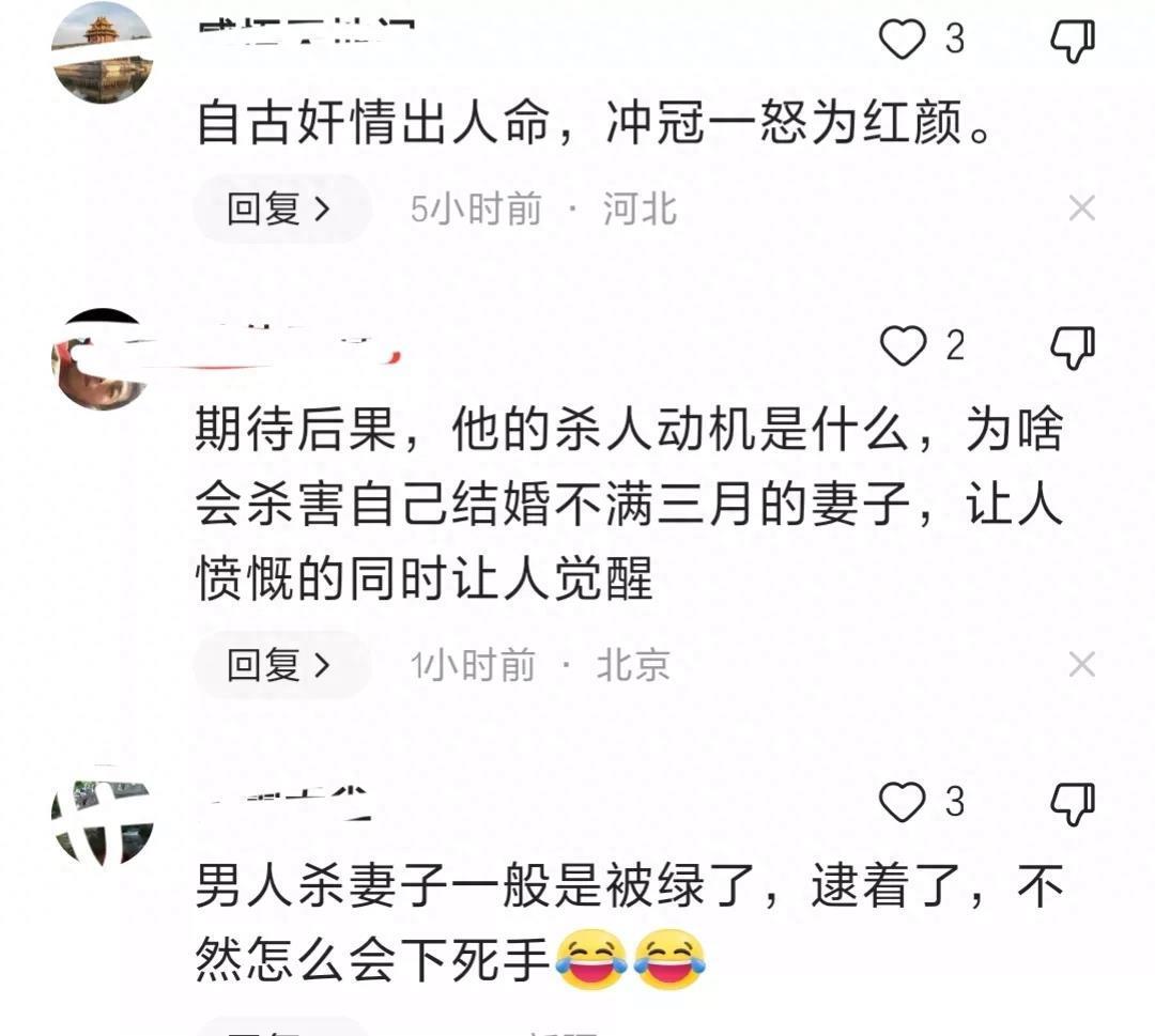 每当发生丈夫杀害妻子的案件时,网络上都会有很多舆论。有网友这样评价:自古奸淫杀人,此人肯定是被骗了。有人说,女方一定收了很高的彩礼,现在离婚了,男方承担不起。此评论纯属猜测。