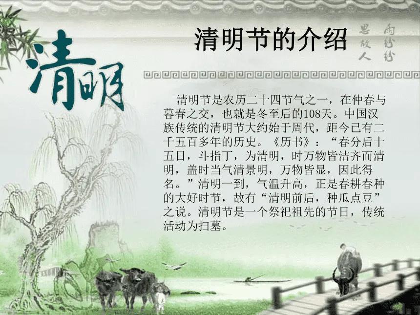 清明是我国二十四节气之一,清明和春分、谷雨、立夏这些节气并没有什么不同。自从晋文公为了纪念介子推设立了寒食节以后,因为寒食节刚好是清明这个节气的前一两天(历法不同,说法也不同),随着时代的变迁,逐渐把寒食的习俗移到清明之中。宋代之后,寒食扫墓之俗移到清明之中,踏青春游、荡秋千等习俗也在清明时举行。清明节便上升为重要的大节日了,有取代寒食节的发展趋势。