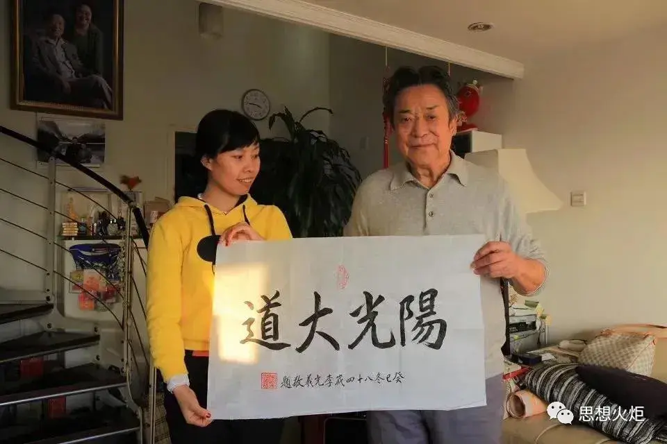 大概近十年前,2013年12月31日跨年,我们导演组陪同李光曦王紫薇两位老师一起到天津和平区。录制节目《咱们老家》。我们去策划节目时到了他们家里,李老师给我们栏目组写了幅字,当时他84岁,紫薇阿姨77岁,他们相差7岁。