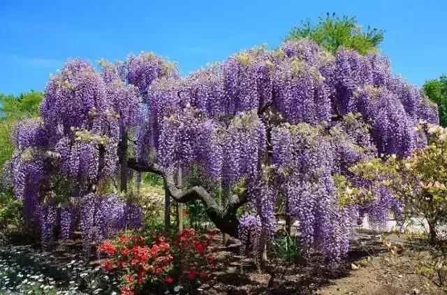 足利花卉公园(あしかがフラワーパーク)的紫藤/枥木,1997年,搬迁至此的足利花卉公园,1000平方米的大藤架、八重的大藤架、80m长的白藤隧道等,“世界第一美丽的紫藤”名不虚传。