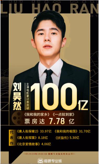 刘昊然成为继吴京、黄渤、张译、杜江、邓超、沈腾、欧豪、王宝强后中国电影市场第九位华语破百亿演员,且是首位95后破百亿票房的电影人。所以,一个小问题,刘昊然出演的电影你都看过吗?