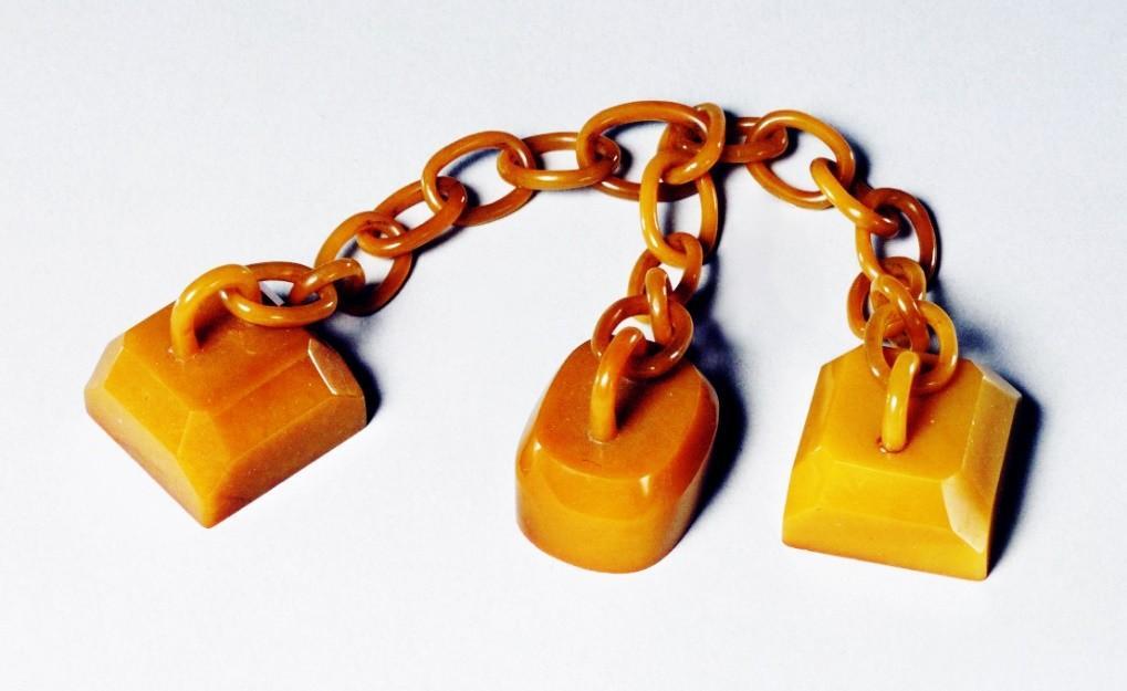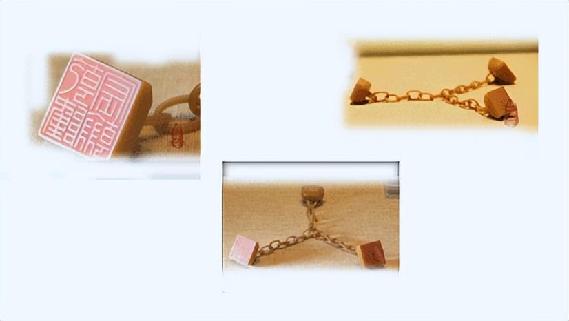 田黄三连印章为乾隆御宝三方田黄石印章,用田黄石雕成的链子连接右边一枚为正方形高一厘米,边长2.6厘米,印文乾隆宸翰,中间一枚为椭圆形高一厘米长径三厘米,短径2.3厘米,印文乐天,左边一枚为正方形高一厘米,边长2.6厘米,印文惟精惟一 。