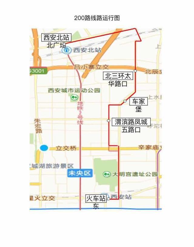 由西安北站北广场始发,经元凤二路、东兴路、东风路、阳光大道、龙朔路、武德路、太华北路、凤城八路、渭滨路、凤城一路、太华路、环城北路至火车站东。回程:由火车站东发车,经环城北路、太华路、北二环、渭滨路恢复原线路运行。